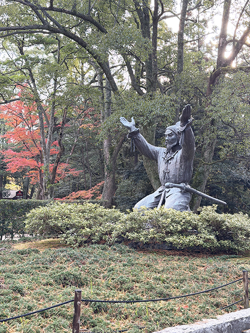 「松の参道」は根の保護の為真ん中を通る事が出来ませんでした。右側を歩くと、大きな像が目に入ってきます。