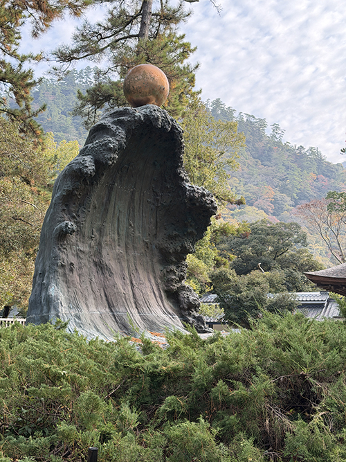 でかい!「ムスビの御神像」 大国主神が両手を上げて幸魂奇魂(さきみたまくしみたま)から「おかげ」を受け取り、縁結びの大神になったシーンを表しています。反対側には、大きな玉が飛び出てきています。