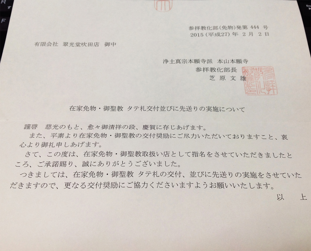 本願寺様より免物・御聖教取扱い指定店の認定をいただきました。 ~翠光堂仏壇店~