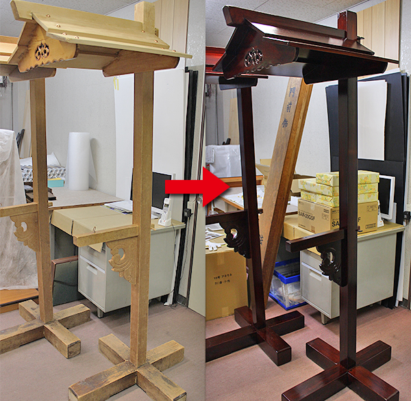 以前の白木の状態とは異なり、木目を活かした重厚な色と艶に仕上がりました。