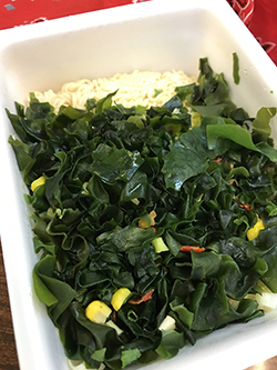 かやくに乾燥わかめが沢山入っていて、三分待てばこの通りMAXです。