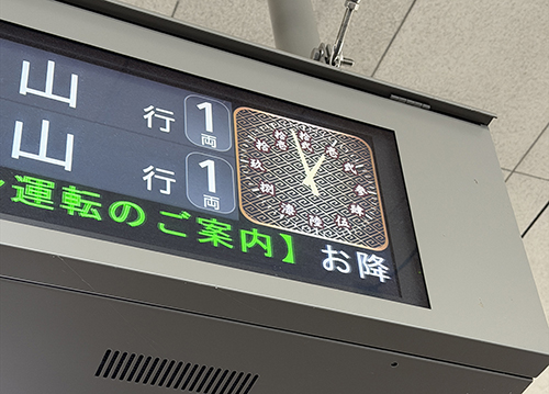 四条大宮駅の電光掲示板。時計の文字が漢数字。しかも旧字体。壱、弐、参、肆(4)、伍、陸、漆(7)、捌(8)、玖(9)拾、拾壱、拾弐と書かれています。
