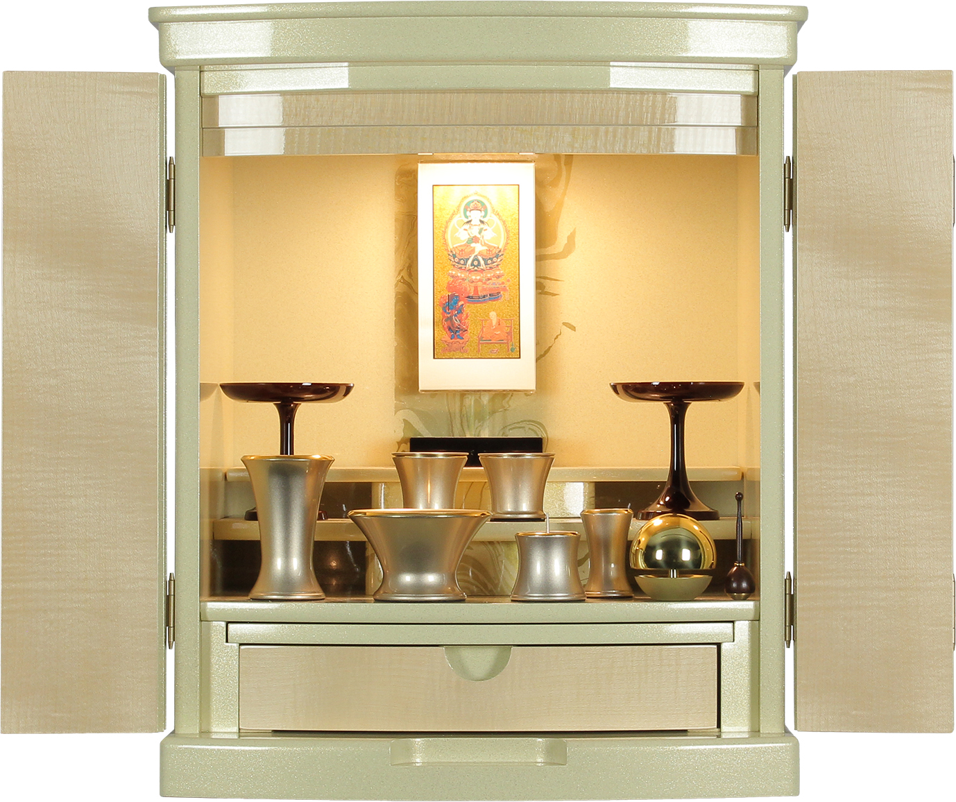 最近は神道やキリスト教の方も、お仏壇の様に故人を祀る祭壇が欲しいとご相談に来られます。この様に白い雰囲気はそういった宗教の方々にもお祀りいただけそうです。