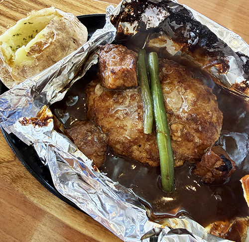 実は、あまりココスに行った記憶がありません。このアルミホイルに包まれたハンバーグは初見です。って、めっちゃ上手いやん!そして激熱…言い方悪いな。熱々で運ばれてきました。ビーフシチューの塊肉も入っていて幸福度上がります。